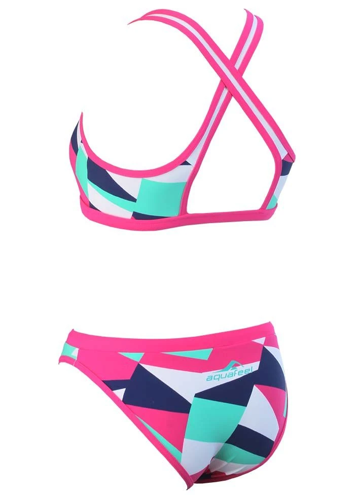 The Women’s digital splash mini cross back swim bikini from Aquafeel offers the wearer unparalleled freedom of movement in the legs, hips and shoulder resulting in a flattering yet effective training swimsuit.